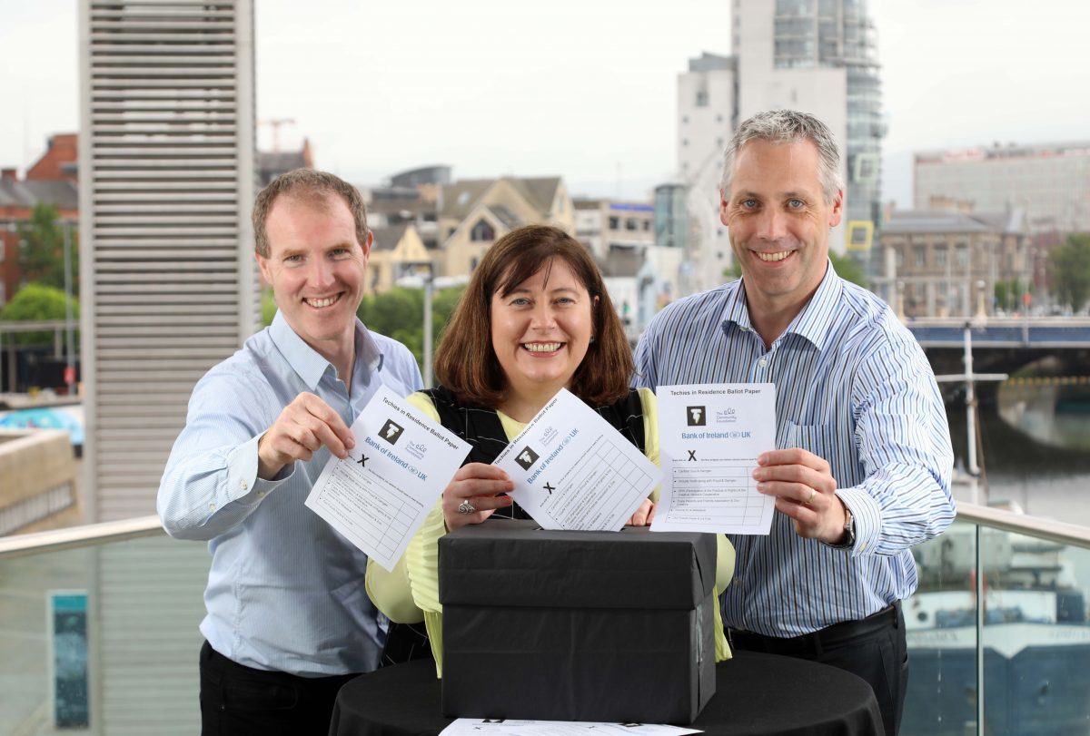 X marks the spot: Paul Braithwaite Head of Innovation and Voice at the Community Foundation, Niamh Griffin, Snr Manager Business Banking and Gavin Kennedy, Head of Business Banking NI, both Bank of Ireland, get in some early voting practice for the ‘Techies in Residence’ showcase in the Guildhall Derry~Londonderry on June 11th, where audience members will get to decide which ‘Tech for Good’ projects will benefit from a £25k seed fund.